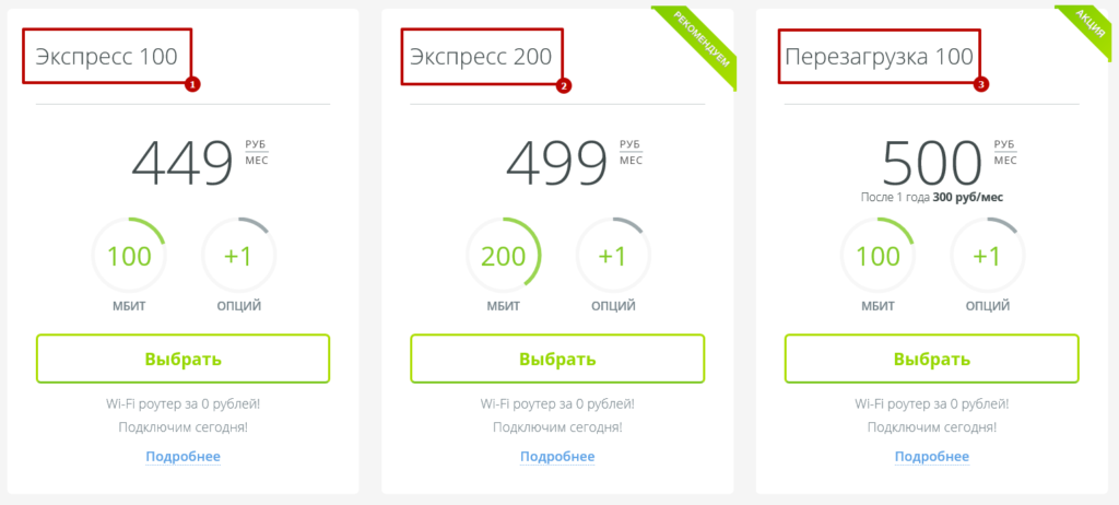 - Экспресс 100. Ежемесячная стоимость 449 р. Скорость интернета 100 Мегабит/сек. Включает в себя одну опцию – бесплатный Wi-Fi маршрутизатор в аренду на любой срок.