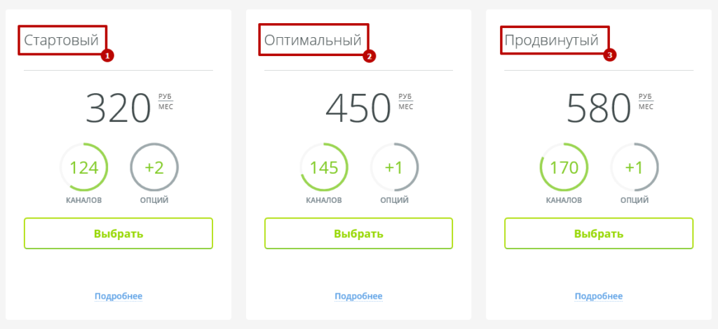 - Тариф «Стартовый» – цена 320 руб./месяц, 124-канала;