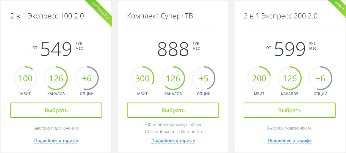 - 2 в 1 Экспресс 200 ( свыше 599 рублей). В этот тариф помимо 126 каналов входит 200 мб на домашний интернет и возможность аренды оборудования стоимостью в 10 рублей.