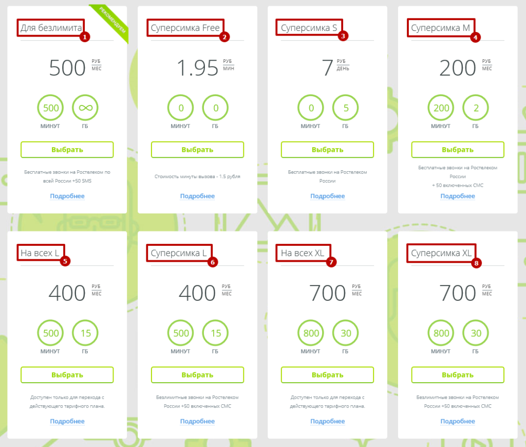 Для своих (199 рублей). Включено минут – 200. Мобильный интернет – 4 Гб. Безлимитные звонки на все номера Ростелеком по всей России