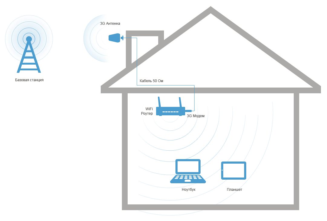 Антенна устанавливается на улице, в идеале на крыше и направляется в сторону базовой станции сотового оператора. Далее сигнал по кабелю передаётся на сам роутер и обеспечивает сеть Wi-Fi интернета внутри помещения.