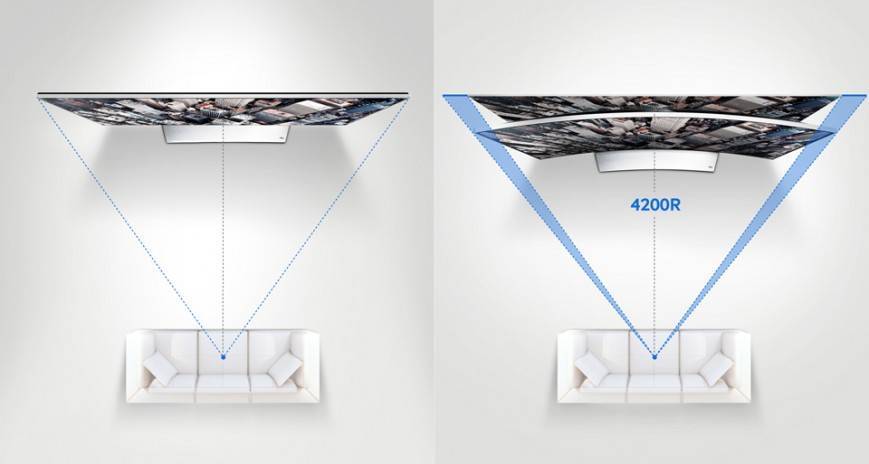 Это один из самых важных факторов, влияющих на предпочтения при выборе изогнутого телевизора. Надо отметить, что только сидя по центральной оси получится ощутить всю прелесть демонстрируемого фильма. Эффективная область просмотра значительно уменьшается по мере удаления в сторону от центральной оси в домашних кинотеатрах с диагональю от 55″ до 70″. Поэтому большая компания вряд ли получит удовольствие от просмотра на подобной ТВ-панели.