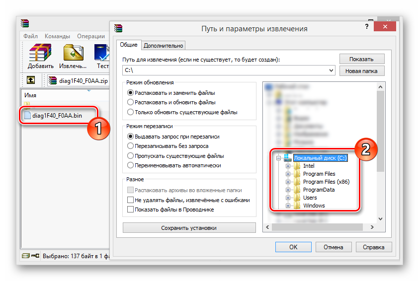 Как и в случае с драйвером, теперь необходимо скачать файл «diag1F40_F0AA» и разархивировать его в корневой каталог системного диска.