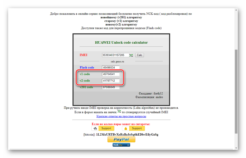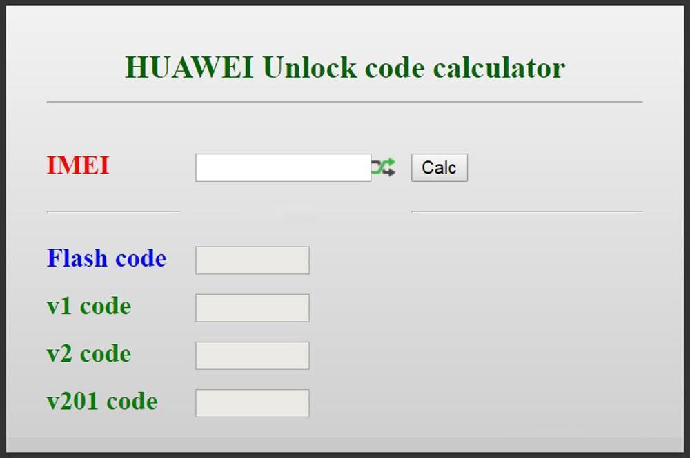 - Если у вас аппарат от марки HUAWEI, узнать необходимый код можно через программку Unlock code calculator — просто запустите её, и вы получите v1 и v2 code, один из них наверняка подойдёт для прошивки вашей модели.