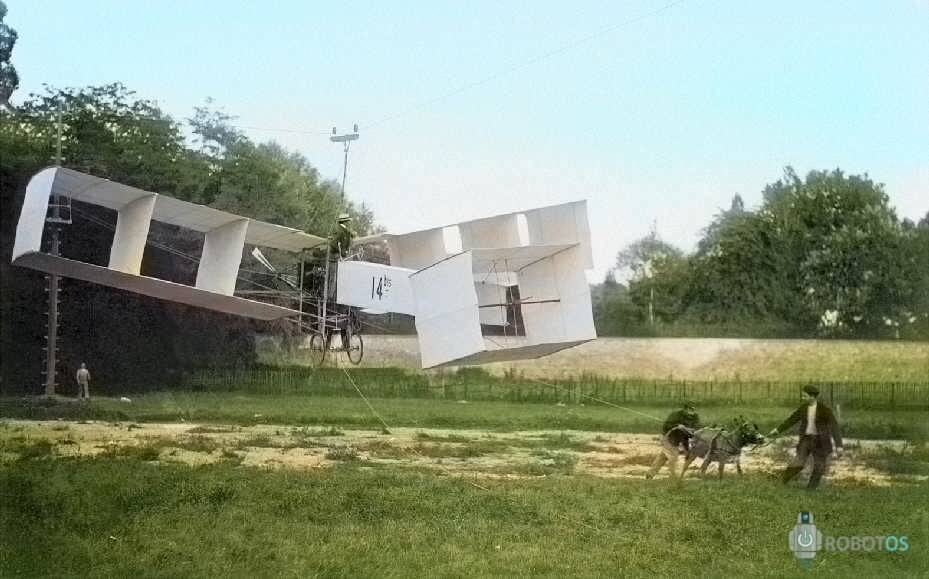 Вот фотокарточка 1906 года, на которой показано одно из первых испытаний самолета Сантоса Дюмона “14-бис” в Париже:
