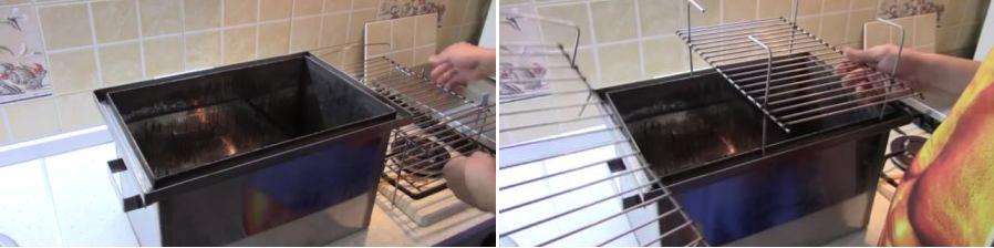 а процесс приготовления пищи не занимает много времени. Достаточно приготовить щепу, предварительно смочив ее в воде, поместить ее на дно прибора. Далее необходимо поместить продукт на решетку и плотно закрыть крышку. Последний шаг — поставить прибор на огонь. В случае использования гидрозатвора — залить его водой.