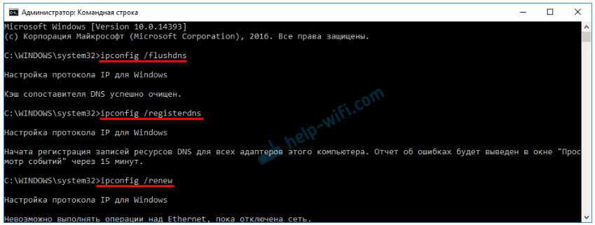Если выше способ не помог, то очистим старые DNS адреса, которые сохраняются локально на компьютере или ноутбуке, также сбросим IP протокол. Для этого запустите командную строку от имени администратора и введите следующие команды по очереди, нажимая Enter после каждой.