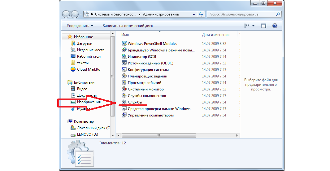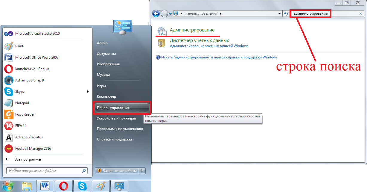 В Windows 7, например, можно нажать правой кнопкой мыши на «Компьютер», выбрать «Управление» и там уже перейти в «Службы».