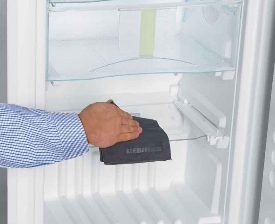 Перед тем как делать обработку агрегат следует отключить от сети. Из морозилки и холодильника вытаскивают продукты. Надо подождать пока прибор разморозится, потом вынуть все съемные детали, которые надо обработать отдельно. Сначала внутри все моют теплой водой, затем приступают к чистке стенок и уплотнителя.