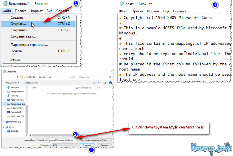 - Теперь надо открыть файл hosts. В блокноте нажмите Файл – Открыть и в новом окне перейдите по пути C:\Windows\system32\drivers\etc.