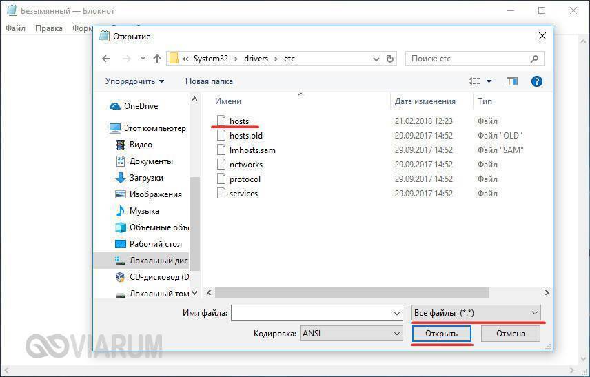 Следующий шаг — открыть файл hosts. Для этого в блокноте выберите «Файл» — «Открыть», перейдите к папке с этим файлом, в поле с типом файла поставьте «Все файлы» и выберите тот файл hosts, который не имеет никакого расширения.