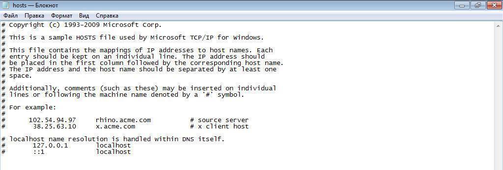 Перед тем, как изменить содержание файла нужно знать, как выглядит содержимое хостс: