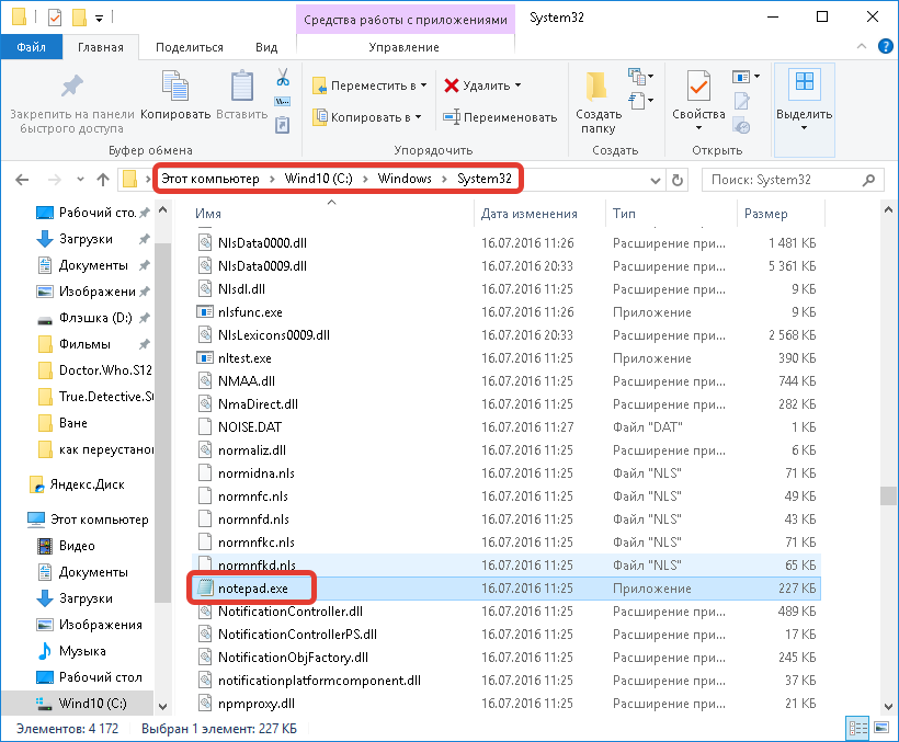 - Перейти в папку с исполняемым файлом приложения «Блокнот». Программа находится в папке System32, которую можно найти на системном диске. Искомый файл имеет обозначение notepad.exe.