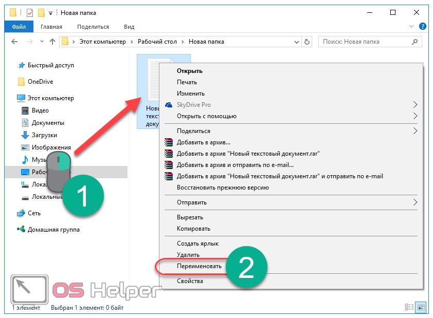 - Находим нужный объект (к примеру, документ), делаем на нём правый клик и в открывшемся меню нажимаем на «Переименовать».