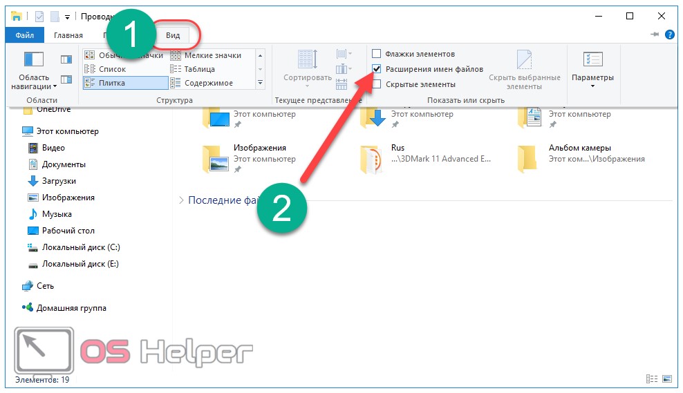 - Остаётся перейти в раздел «Вид» и убрать галочку с пункта «Скрывать расширения…» для того, чтобы система начала их показывать. Нажимаем «ОК».
