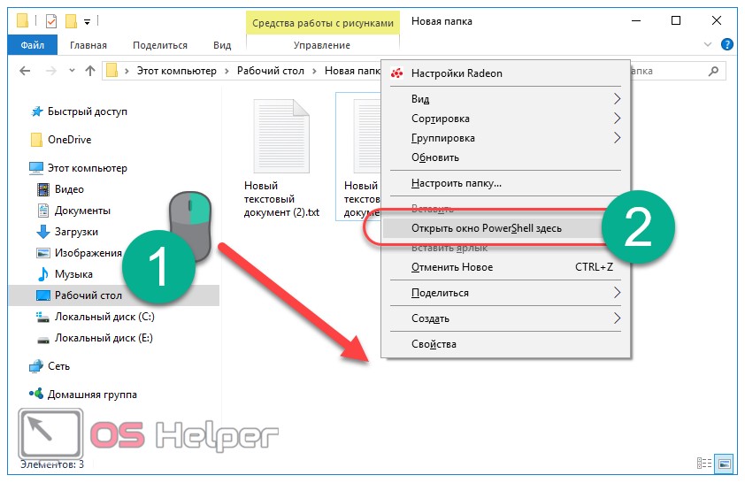 - Открыть папку, в которой содержатся все необходимые объекты, и кликнуть правой кнопкой мыши в окне, при этом должна быть удержана клавиша Shift . Кликаем на «Открыть окно команд». На месте данной строки может быть также «Открыть PowerShell здесь».