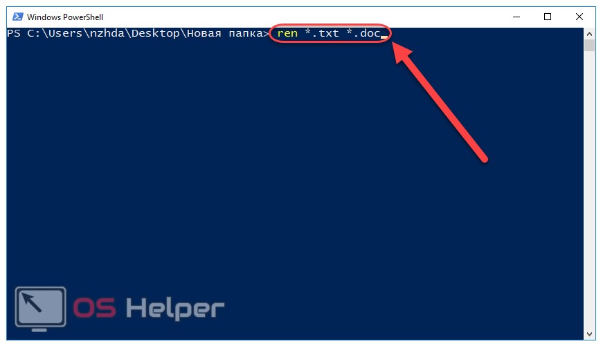 - В окне прописываем «ren *.txt *.doc», где на месте «*.txt» – исходное расширение группы файлов, а на месте «*.doc» – конечное, т.е. нужное. Учитывайте, что изменения коснутся только тех объектов, у которых значение совпадает с указанным исходным. Нажимаем Enter .