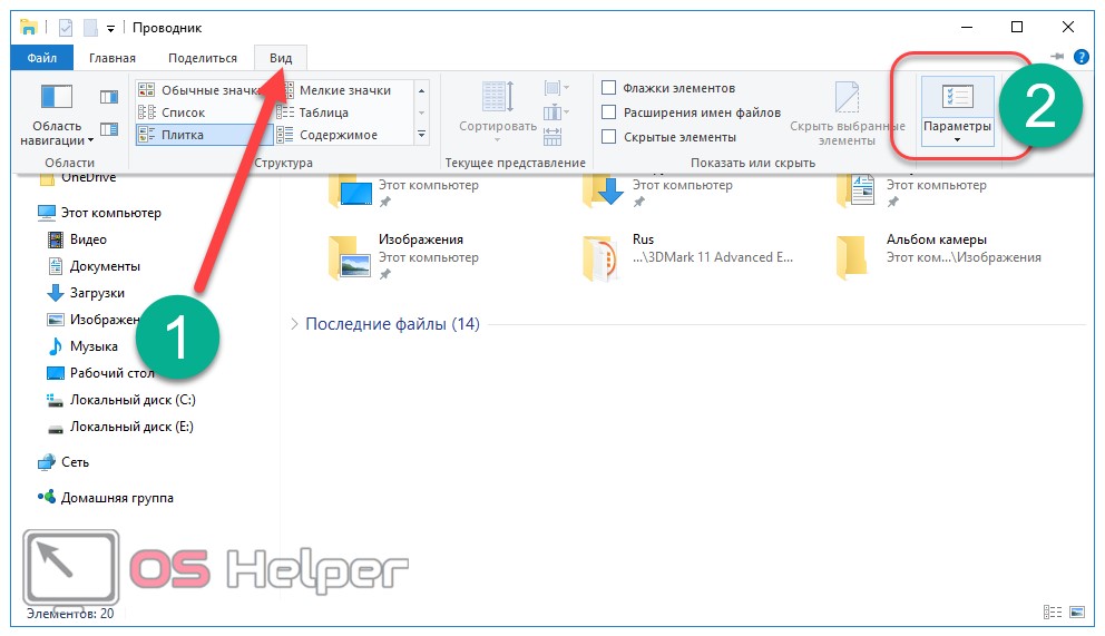 - Перейти в папку и во вкладке «Вид» нажать на кнопку «Параметры».
