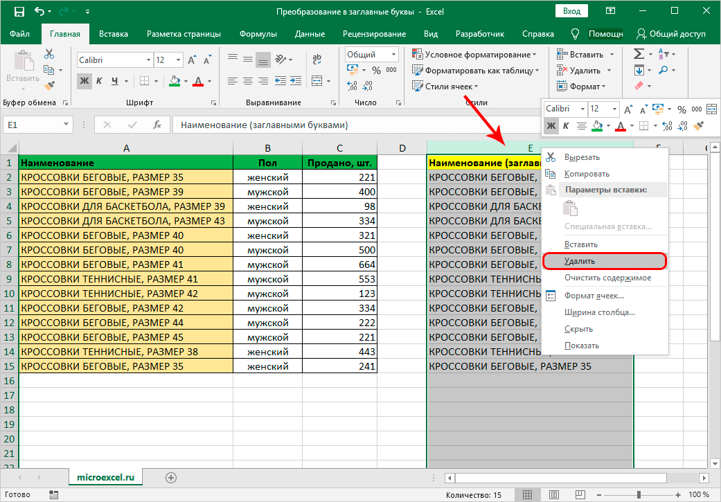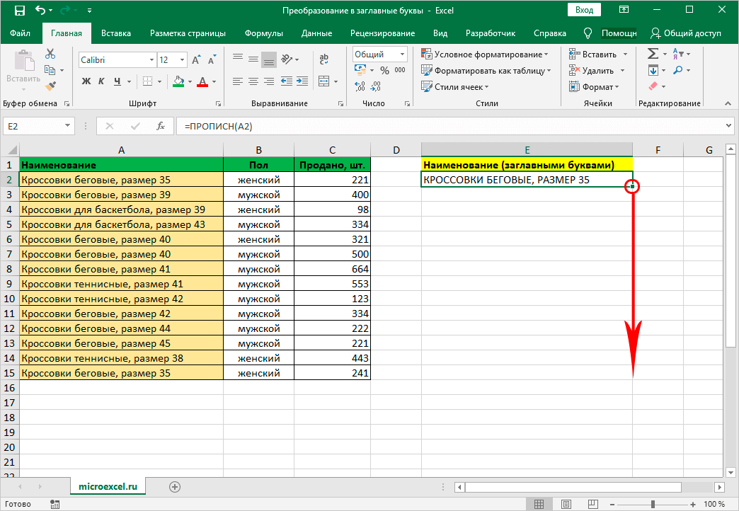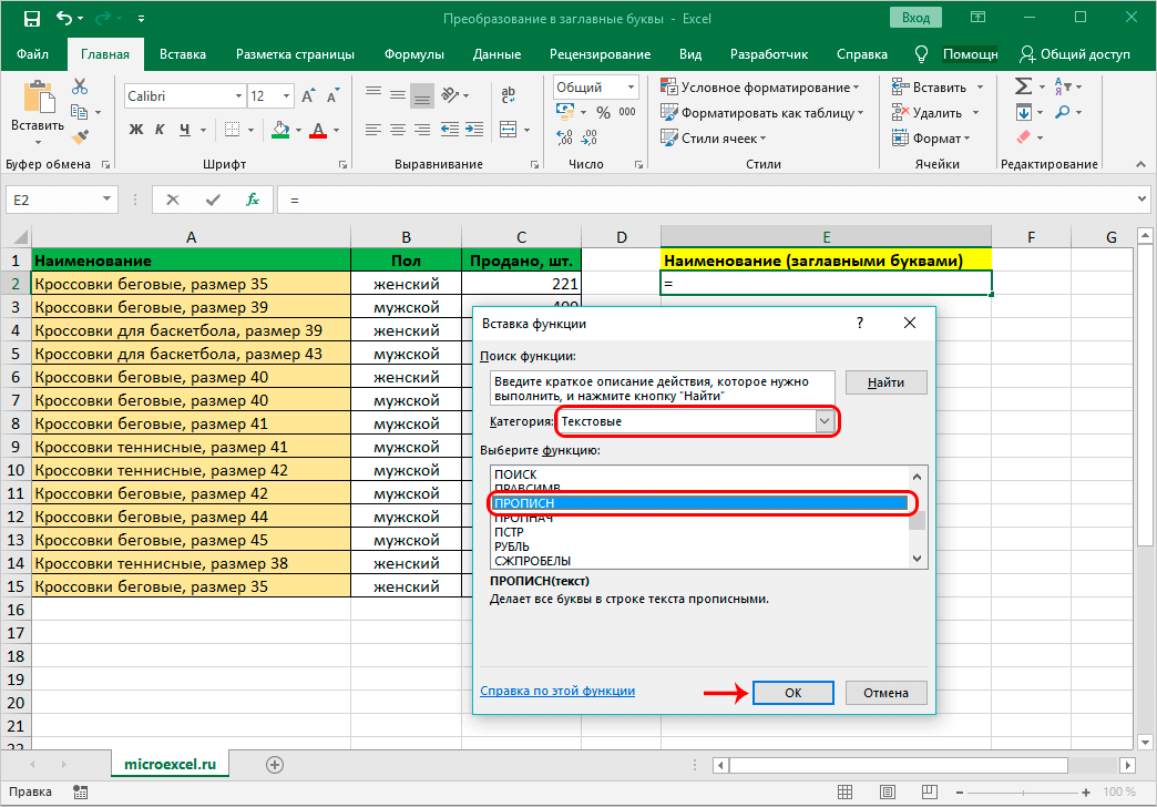 - Функция ПРОПИСН(). Аналогичная предыдущей, только превращает все наоборот в заглавные (прописные) буквы.