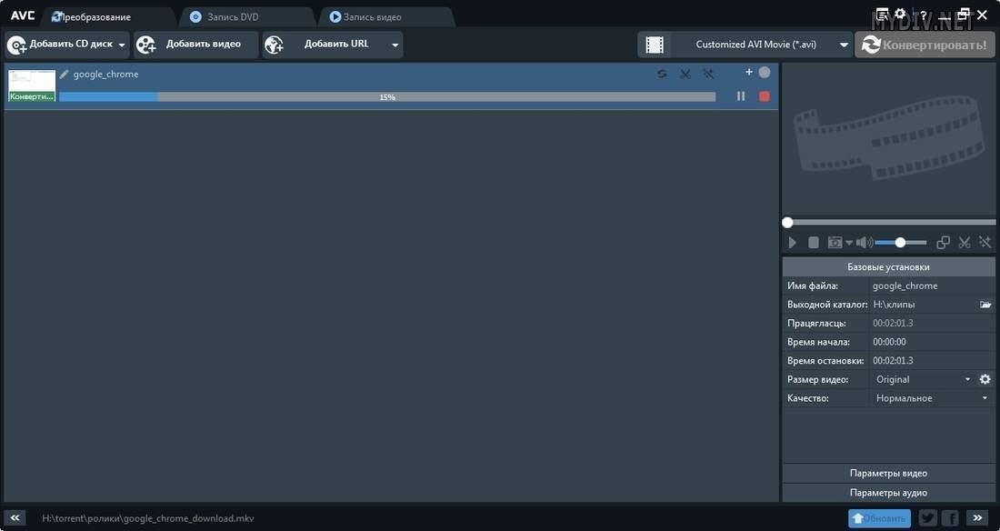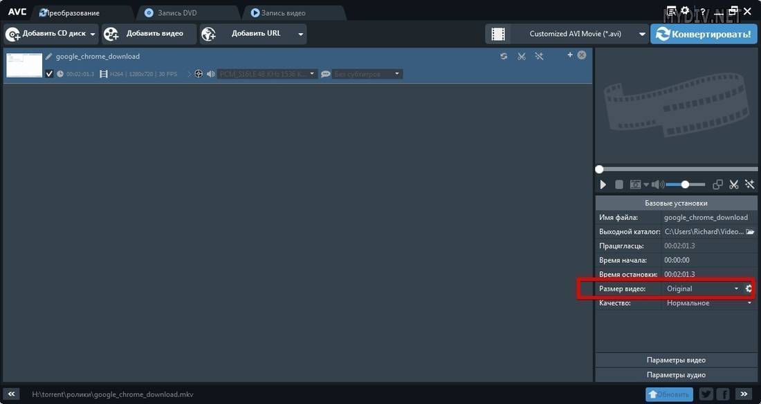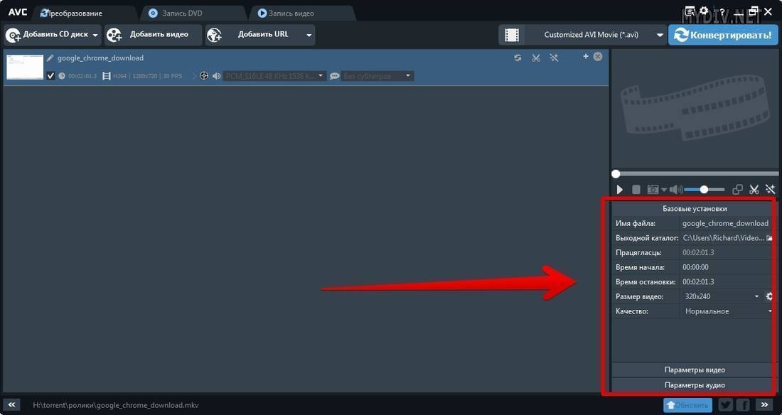 Процесс подходит к концу. Остаётся только задать путь сохранения в окне под плеером предпросмотра. Затем нажимайте на кнопку «Конвертировать» и ждите окончания процесса. Это зависит от веса и конечных настроек получаемого файла, однако обычно не занимает больше нескольких минут.