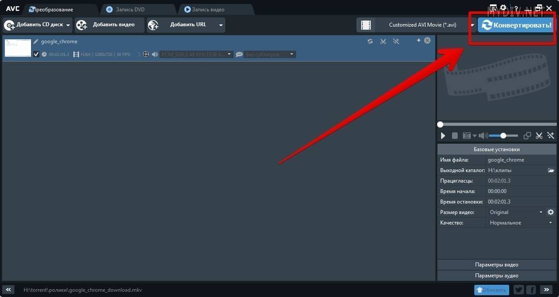 Видео быстро добавится в программу, а пользователю предстоит выбрать нужный выходной формат файла. В данном случае необходимо нажать на кнопку «AVI».