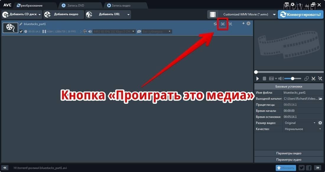 Бывают ситуации, когда вам потребуется вырезать какой-либо фрагмент видео. Для этого в редакторе предусмотрена кнопка Проиграть это медиа. Нажимаем на нее:
