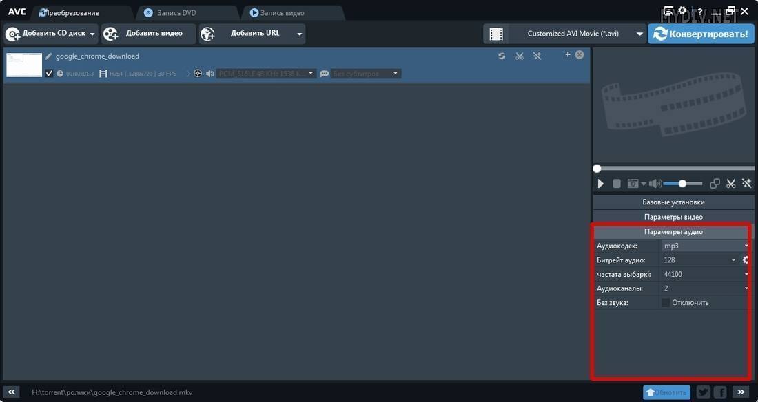 Во вкладке Параметры аудио – аудиокодек, битрейт аудио, аудиоканалы. Также при необходимости здесь можно отключить аудиодорожку: