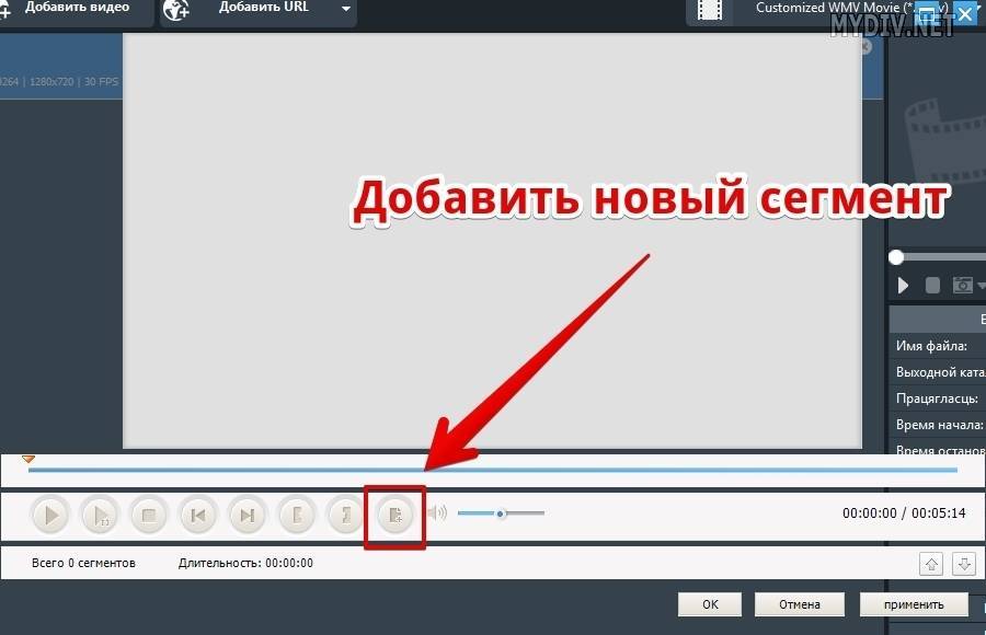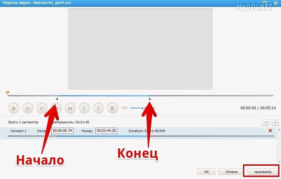Теперь вы можете двигать ползунки, которые отмечены на скриншоте ниже, чтобы вырезать любой фрагмент в видео. Как только вы определитесь с началом и концом сегмента, нажмите на Применить: