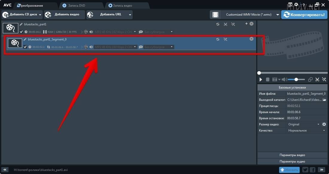 Аналогичным образом выбираем формат видео для нашего фрагмента, указываем параметры и жмем кнопку Конвертировать.