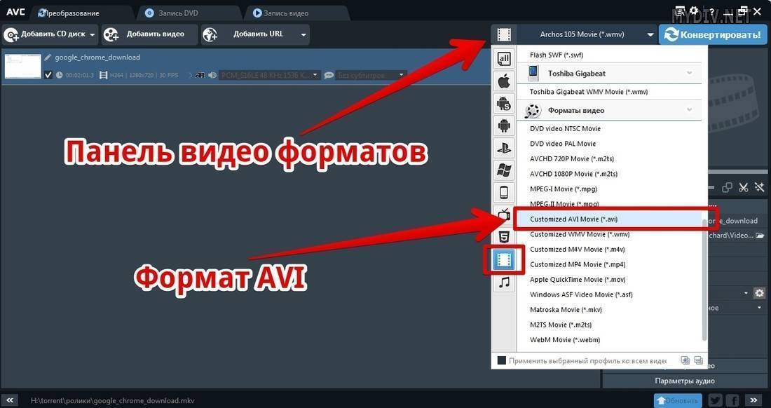 Итак, попробуем преобразовать наш добавленный файл из формата MKV в AVI. Для этого открываем панель видео форматов, кликаем на пленку с кинопленкой (Форматы видео) и ищем в этом разделе формат AVI или любой другой по необходимости: