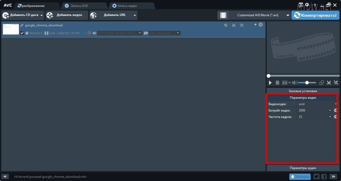 Во вкладке Параметры видео выставляем видеокодек, битрейт и частоту кадров: