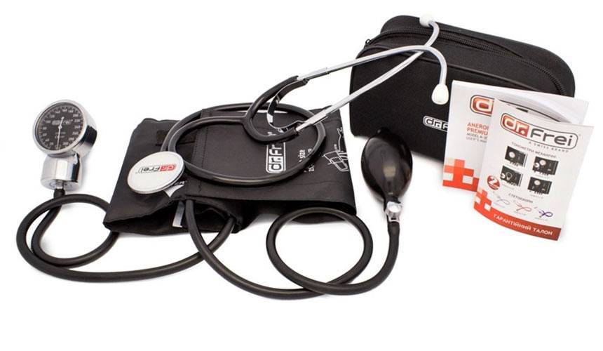 - Механический тонометр. Данный аппарат представляет собой комплект, включающий манжету на липучке с пневматической камерой, манометр, соединительный шланг и резиновую грушу с раскручивающимся клапаном. Дополнительно используется стетоскоп.