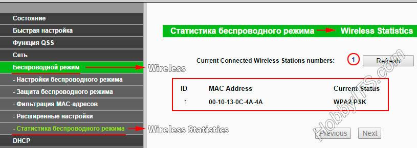 Обратите внимание: Некоторые старые модели роутеров TP-Link не получили обновление прошивки до русского языка. В них нужно нажимать на пункты «Wireless» — «Wireless Statistics», чтобы посмотреть список подключенных по беспроводному протоколу устройств