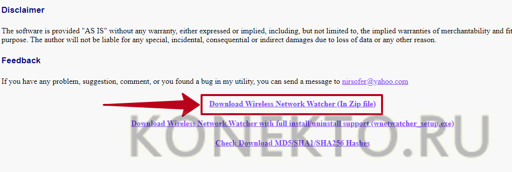 - Скачаем утилиту из официального сайта разработчика (качайте только из проверенных источников!). На странице находим «Download Wireless Network Watcher (In Zip file)». Жмем и загружаем архив.