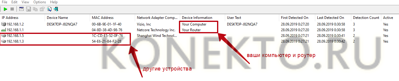 Обратите внимание на столбец «Device information». По нему вы сможете сразу определить, какие из обнаруженных устройств являются вашим ПК и роутером — они подписаны «Your Computer» и «Your Router» соответственно