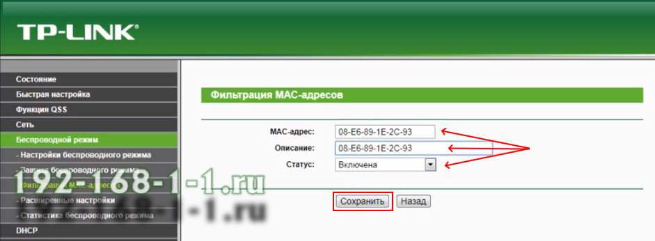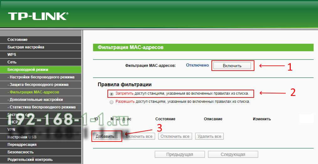 Мы определили все подключенные устройства – отлично! А как быть если одно из них – это злоумышленник, например?! Как отключить пользователя от WiFi так, чтобы не мешать другим?! Тут тоже ничего сложного. Надо просто внести этого пользователя в чёрный список. Покажу опять же на примере TP-Link.