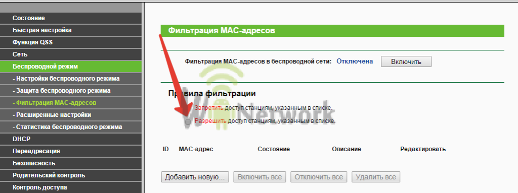 2. В меню «Wi-Fi/Беспроводной режим» выберете вкладку «МАС-фильтр/Фильтрация MAC-адресов». На вкладке режим фильтра выберите пункт «Разрешать».