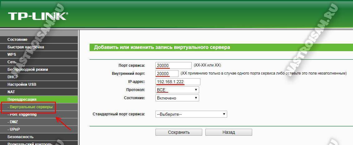 Далее, идём в настройки роутера и находим раздел «Виртуальные серверы»(Port Forwarding).