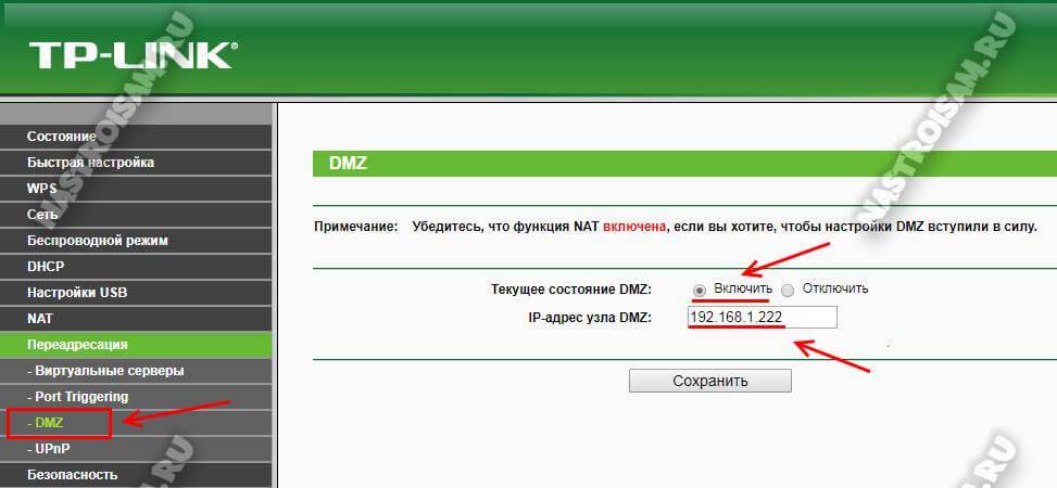 Но, к сожалению, не всегда есть возможность сменить порт. В этом случае можно использовать другой вариант — Демилитаризованная Зона роутера. В его настройках находим подраздел DMZ и открываем его: