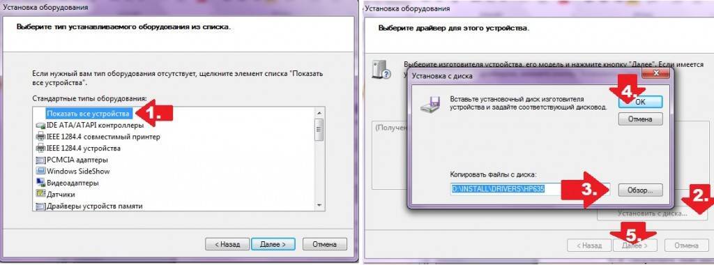 В новом окошке дважды кликаем пункт «Показать все устройства», а затем выбираем вариант «Установить с диска». После этого остается лишь найти и указать путь к драйверам, нажать кнопку OK и перейти к последнему шагу с помощью кнопки «Далее»: