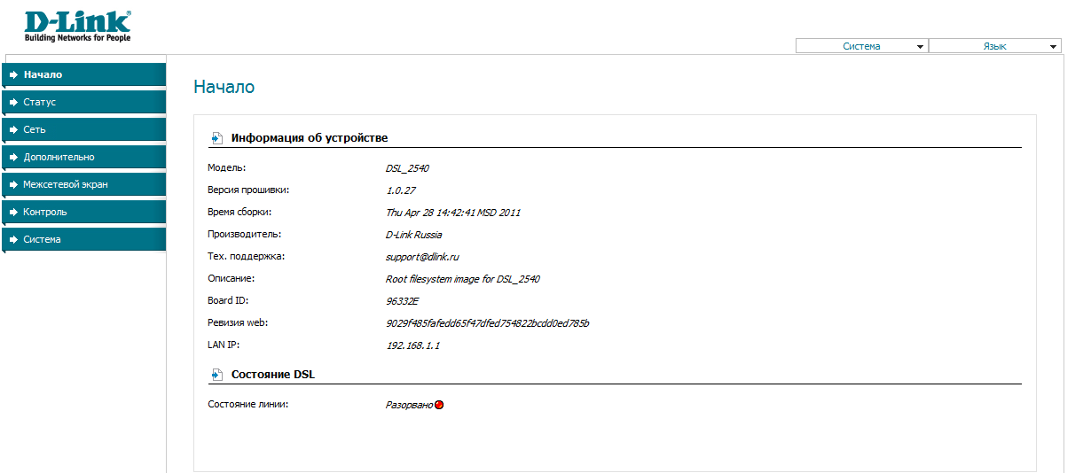 После авторизации Вы попадаете на статусную страницу роутера, где указаны все данные о состоянии ADSL-подключения и Интернет-соединения.
