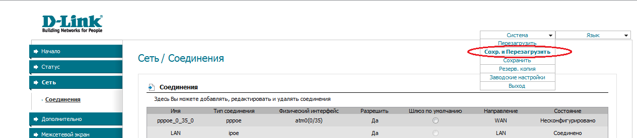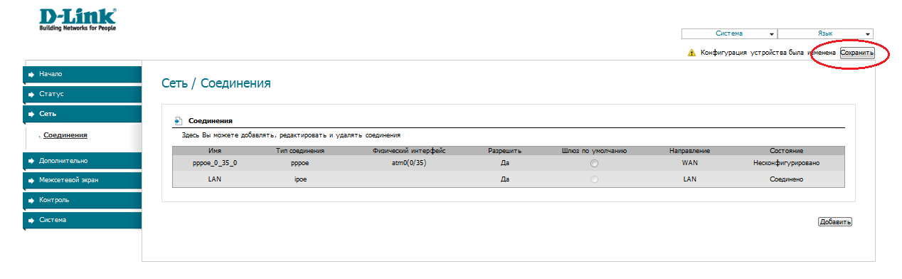 Во вкладке, которая теперь открылась, нужно выбрать расширенные настройки роутера D-Link. В левом меню выбираем «Сеть», дальше «Соединения». Нажимаем кнопочку «добавить».