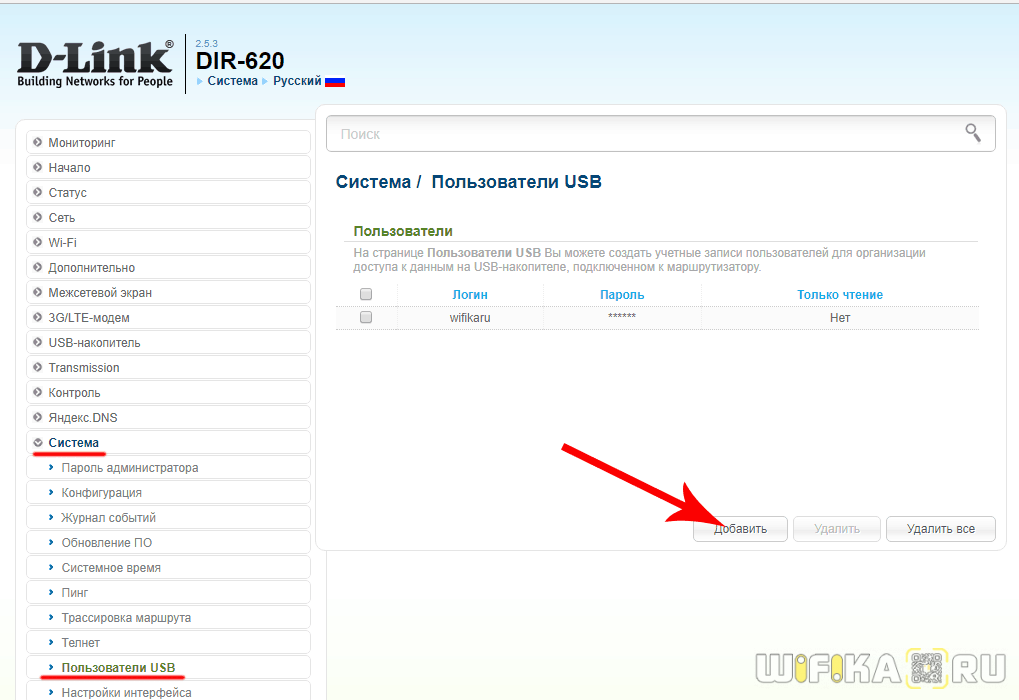 Отлично! Прежде чем создать собственно FTP-сервер D-Link, нужно добавить пользователя для подключения к нему. Для этого идем в раздел «Система — Пользователи USB». На странице отобразится список уже созданных, если они были, пользователей.