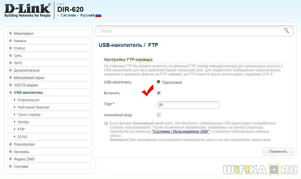 Возвращаемся в раздел «USB-накопитель — FTP». Здесь мы видим, что флеш-накопитель подключен, а значит можно создать FTP-сервер из нашей флешки. Ставим галочку напротив пункта «Включить», прописываем порт «21». Можно также активировать возможность анонимного входа на сервер, но в целях безопасности я бы этого делать не рекомендовал, если, конечно, вы не создаете ftp-сервер для друзей, гостей или коллег с целью обмена с ними файлами.
