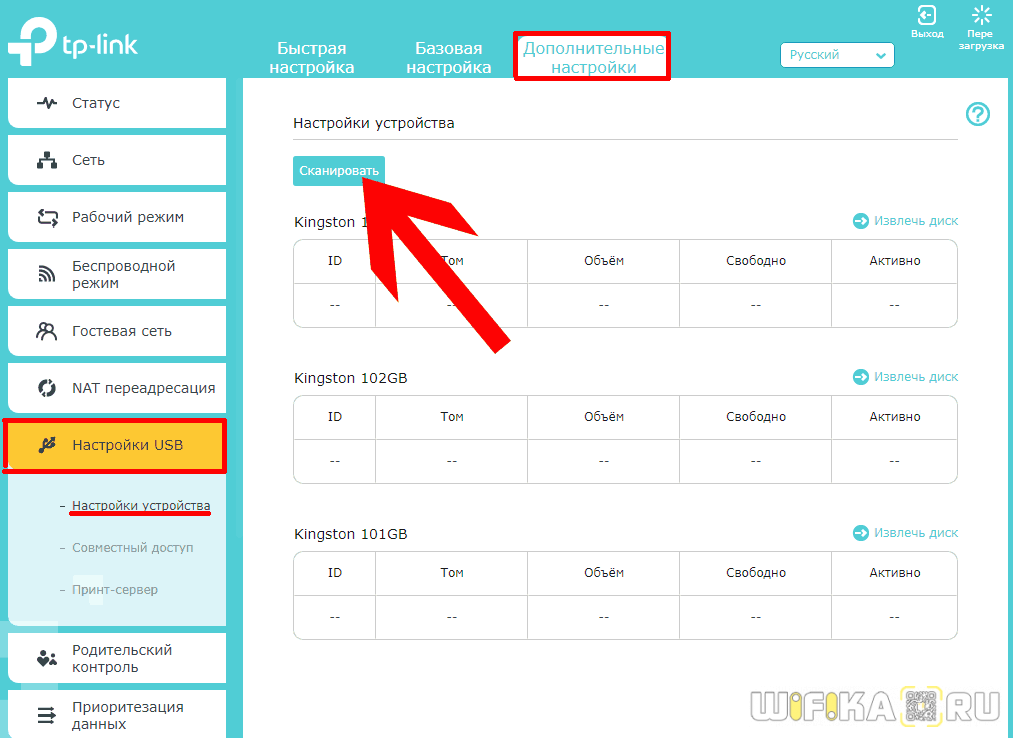 Создание FTP сервера на базе роутера TP-Link мы рассмотрим сегодня на новой прошивке, на которую постепенно переводятся все модели данной фирмы. Открываем вкладку «Дополнительные настройки», пункт «Настройки USB — Настройки устройства». Здесь будет информация о подключенных к роутеру накопителях, для обнаружения нового нажимаем на кнопку «Сканировать». Для отключения — «Извлечь диск».