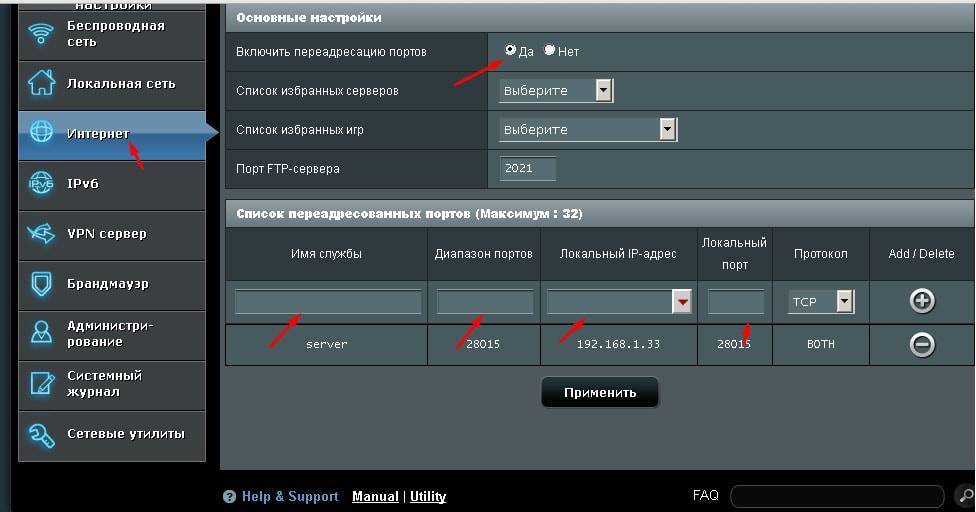 - — перейдите в раздел «Интернет» — «Переадресация портов»;