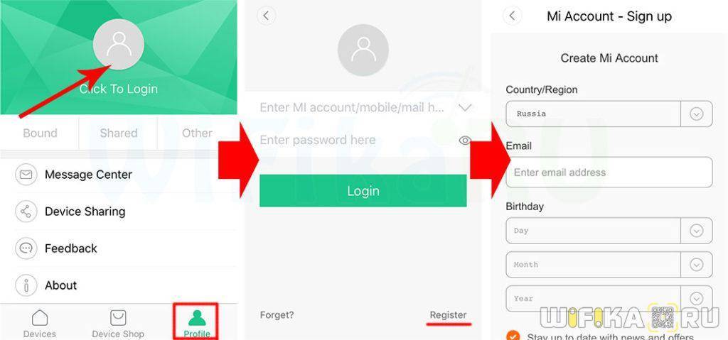Прежде чем добавить сюда нашу камеру, переходим в раздел «Profile» и регистрируемся в сервисе Xiaomi — он понадобится для сохранения видео и для просмотра картинки онлайн через интернет.
