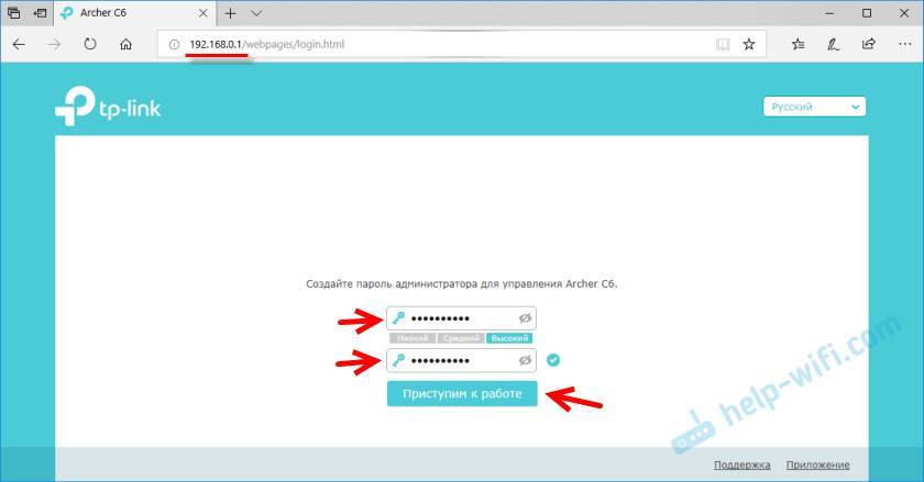 Должна появится страница, на которой нужно установить пароль роутера (пароль администратора). Этот пароль в дальнейшем нужно будет вводить каждый раз, когда вы будете заходит в настройки TP-Link Archer C6. Необходимо придумать пароль, указать его в соответствующем поле (2 раза) и нажать на кнопку “Приступить к работе”.