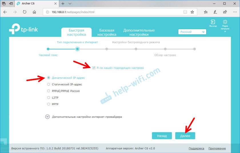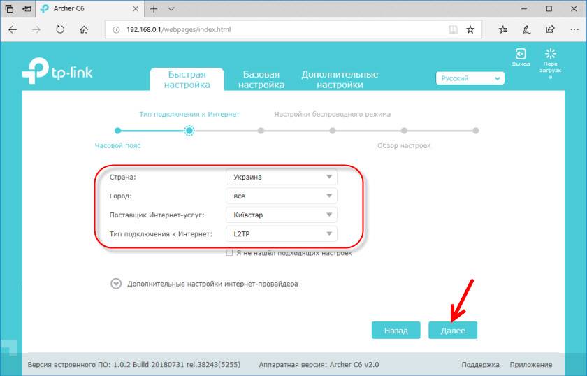 Дальше нужно настроить подключение к интернету. На Archer C6 есть возможность выбрать свою страну, город, провайдера, и тип подключения к интернету. Попробуйте.