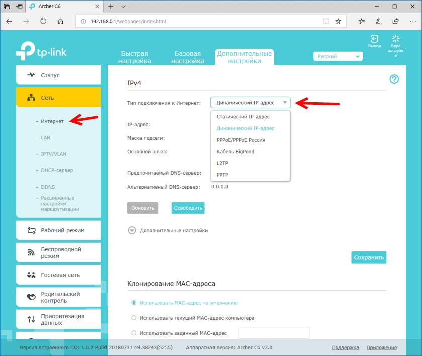 В случае с “Динамический IP-адрес” роутер спросит, нужно ли клонировать MAC-адрес. Это уже зависит от вашего провайдера: делает они привязку, или нет.